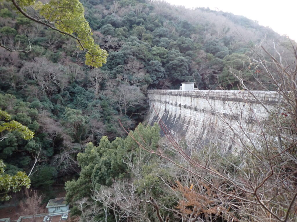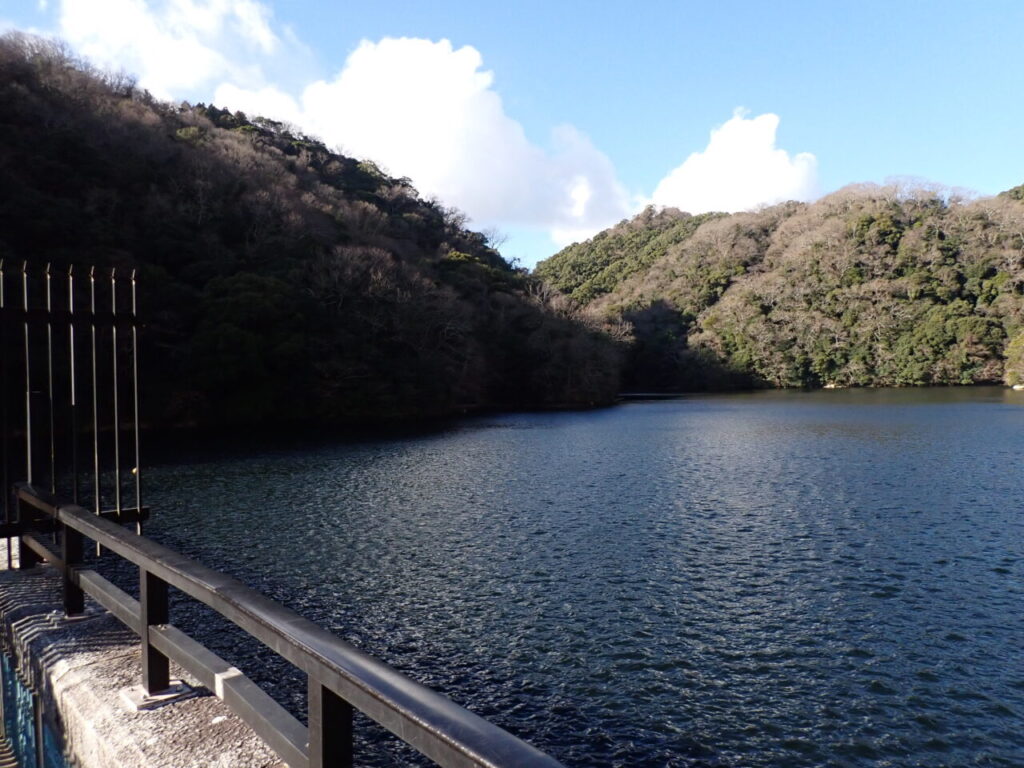 布引のダムを過ぎるころには、太陽は山の向こうにお隠れに。無風の湖面にはオシドリが数羽泳いでいました。観光客が「市ケ原までいけるかな?」と、スマホ片手に追い越していきます。うーん、一本道なのですがちょっと心配。