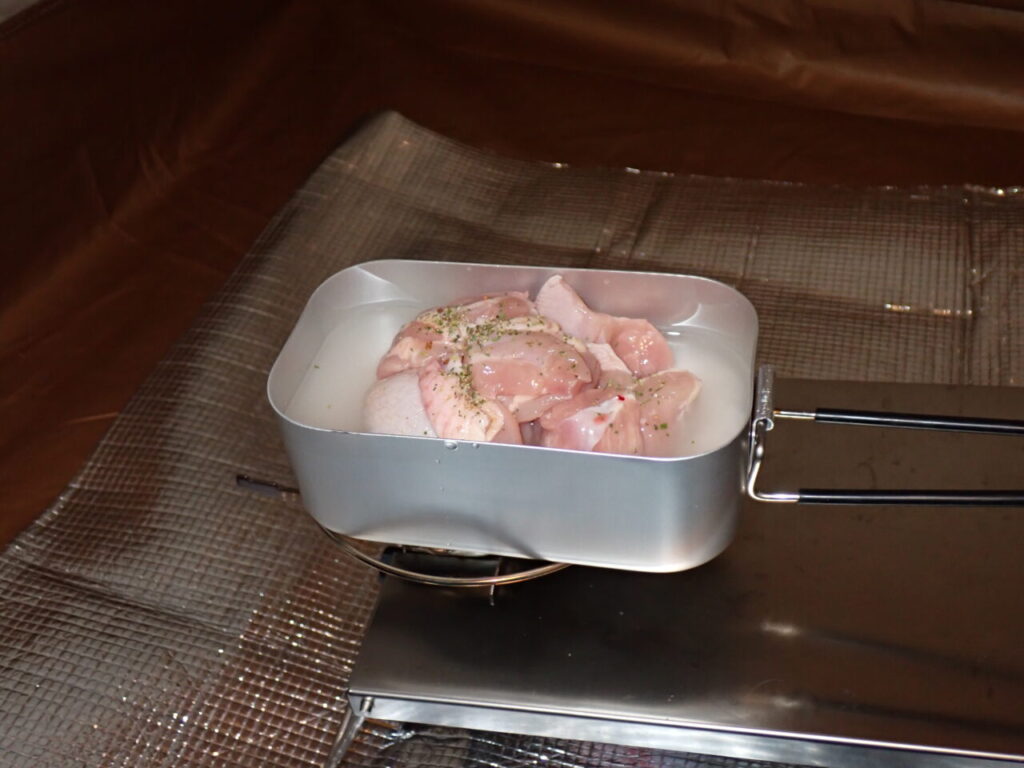 今晩のご飯は、チキン&ビーフカレーです。米は出発前に洗米し、ジップロックにいれ含水させています。鶏モモは軽くハーブソルトで下味をつけ、炊飯と同時に調理します。レトルトカレーは炊飯時、フタにのっけて一緒に温めておきます。