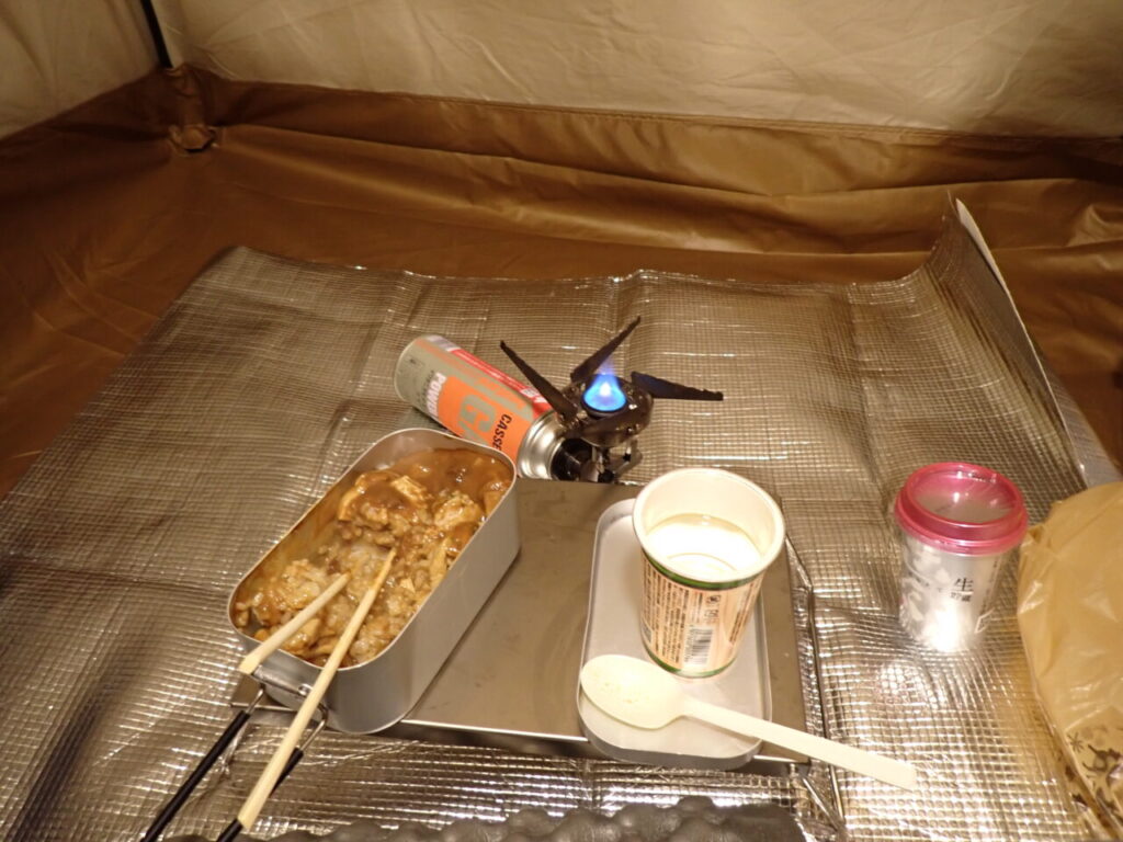 外気温は4℃、テント内は人体の熱で14℃くらいに。スカート付のテントの保温効果に満足しつつも、テント内もさすがに寒くなってきたので、コンロで暖をとります。火力はとろ火ですが、5分ほどでテント内は22℃まで温かくなります。