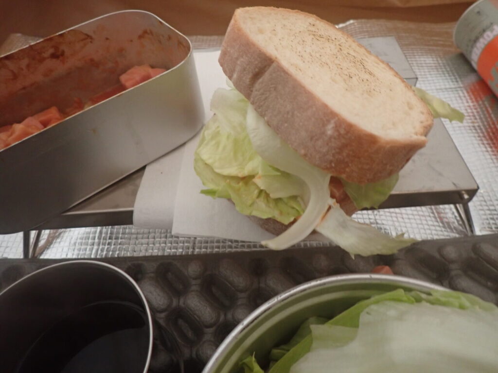 メスティンにこびりついたカレーも調味料です。少し水を加え、カレーを溶かしベーコンをケチャップで炒めます。コーヒーを淹れ、バゲットを軽くトーストすれば、ベーコンレタスサンドの完成です。