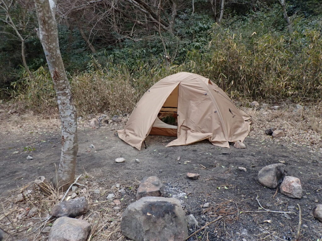 日没は17時07分、一気に暗くなるのと同時に気温がグッと下がって来ました。整地をすませ、真っ先にテントを設営します。